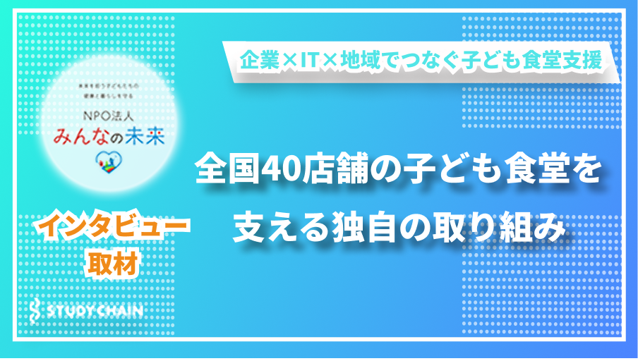NPO法人みんなの未来の「全国こども食堂プロジェクト」について、日本最大級の塾比較サイトであるスタディチェーンさんからインタビューを受けました。
