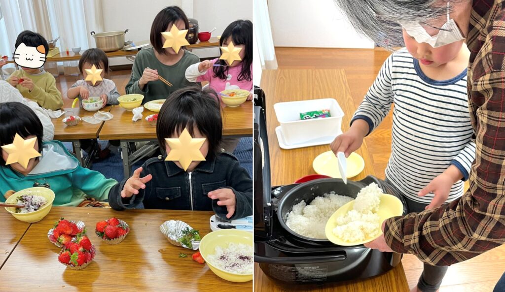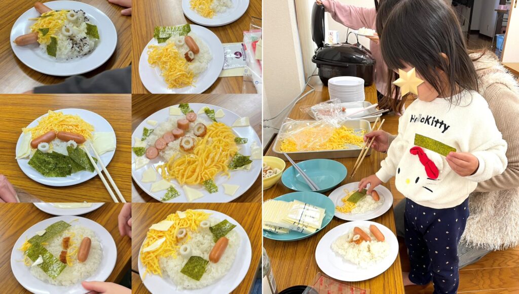 小さいお友達のみんなは、お母さんが作ってくれた自慢のオニさんライスがあったり、一緒に作ったり!