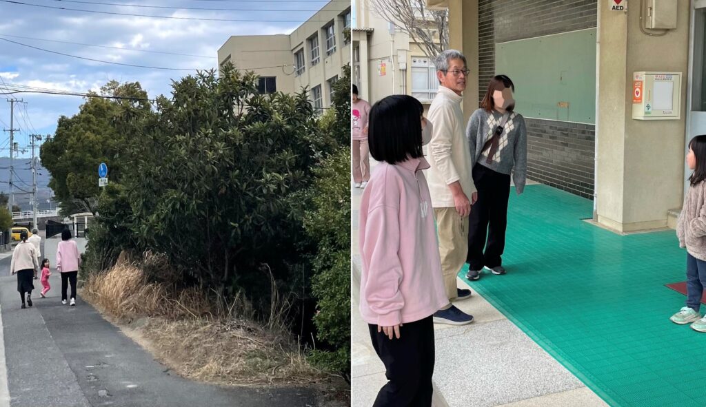 揺れが収まってから避難を想定した、指定避難場所までの安全確認で、お母さんやボランティアさんみんなで歩きました。