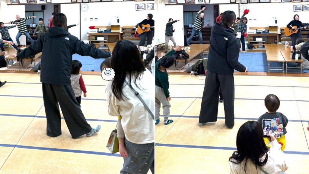 お菓子をたくさんもらったこども達は大満足で、ギターの音色に合わせて