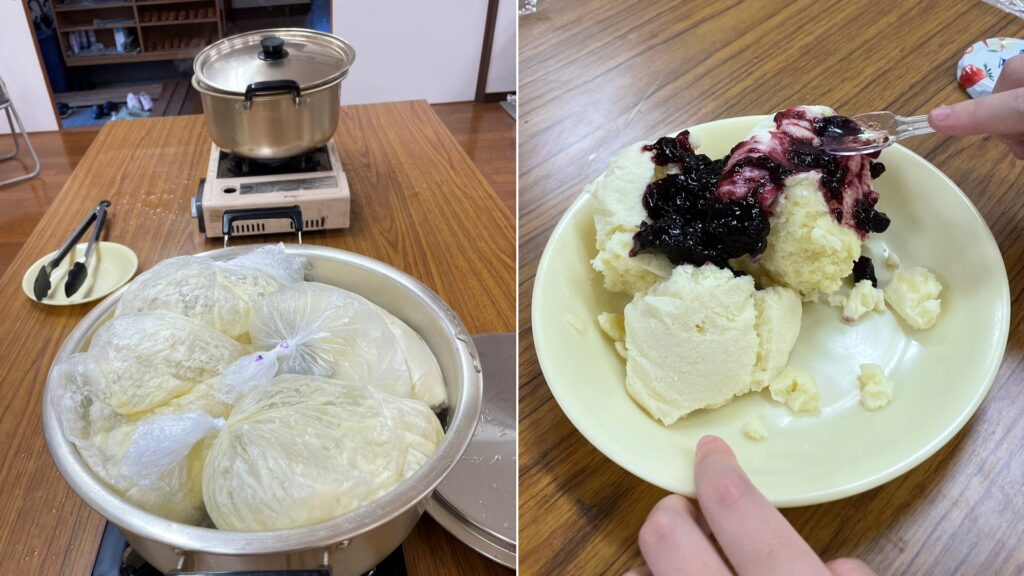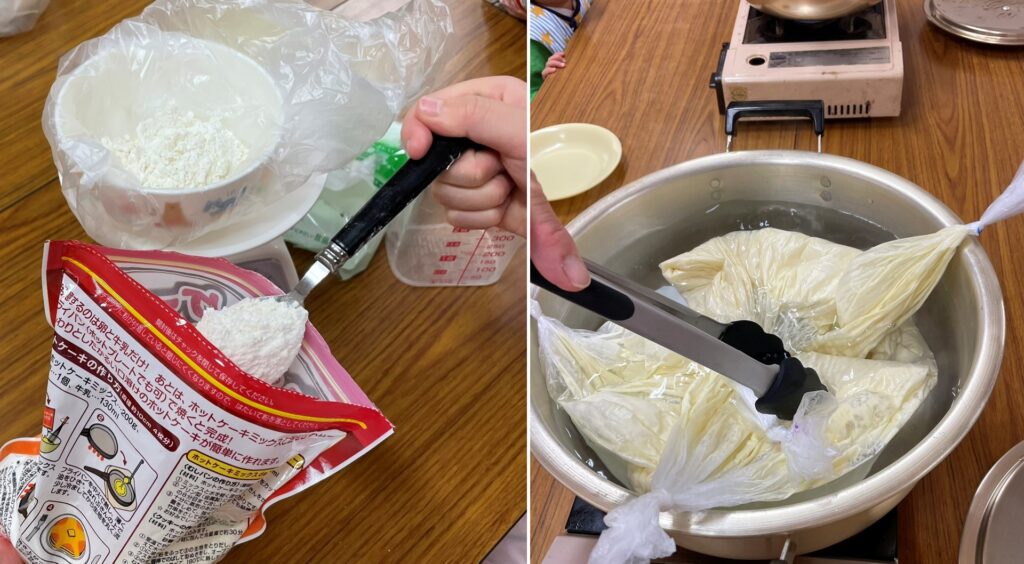 アイラップの中でこねこねして、上手く出来上がったらみんなで集めてお湯の中へ。