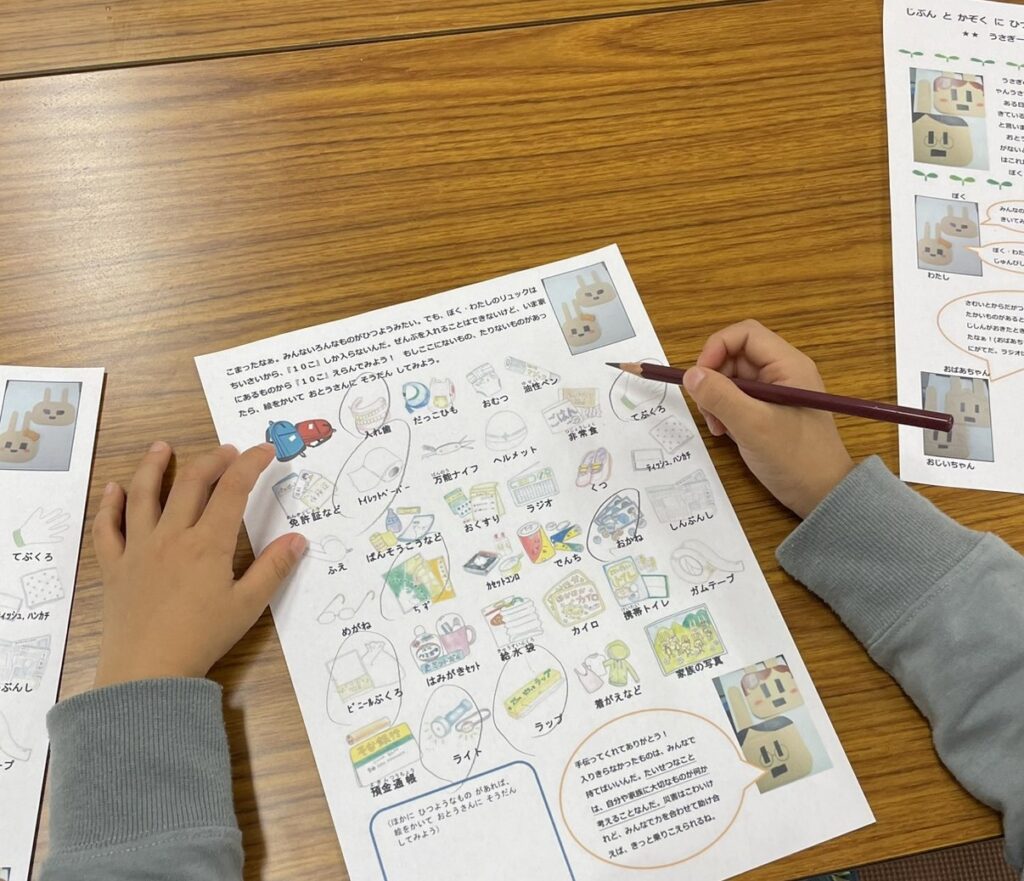 うさぎの家族が登場するぼうさいバッグのおはなしを聞いて、どんなものを準備したいかみんなで考えました。