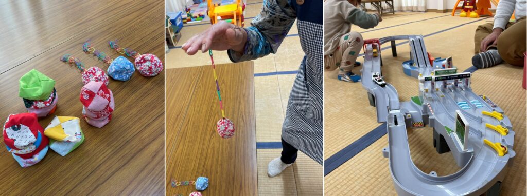 ヨーヨーになっているお手玉もあって、ご近所のおばあちゃんが早速興味津々で揺らしていました。
