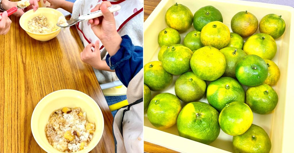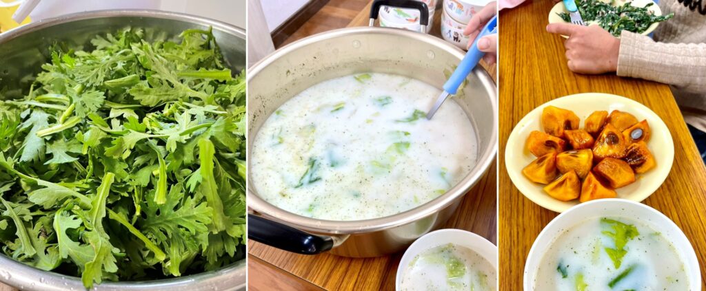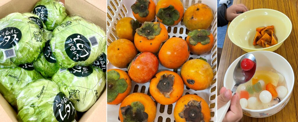 お昼のごはんには、大好きな柿と春菊のサラダを大盛りにして食べた子もいました。