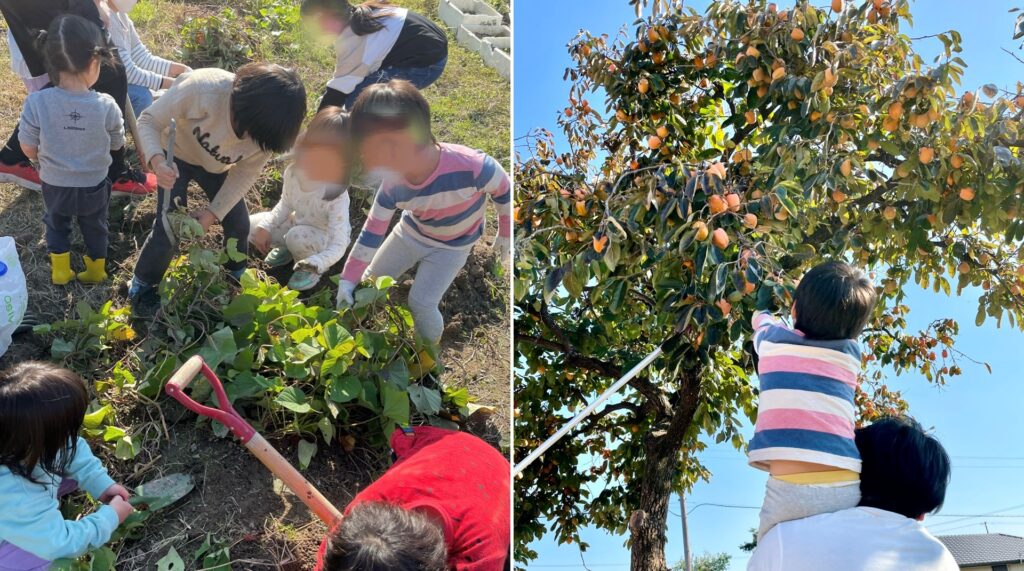 ごはんの後にはみんなでさつまいも掘り、そしてお隣さんから声をかけていただいた柿の収穫です!