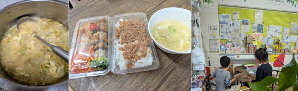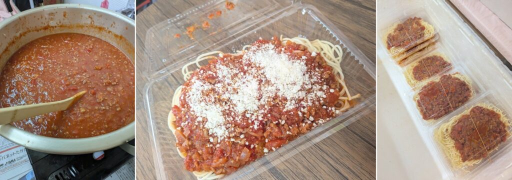 この日は、そぼろがありましたので、ご飯を炊いて乗せたり、スパゲッティや肉団子など